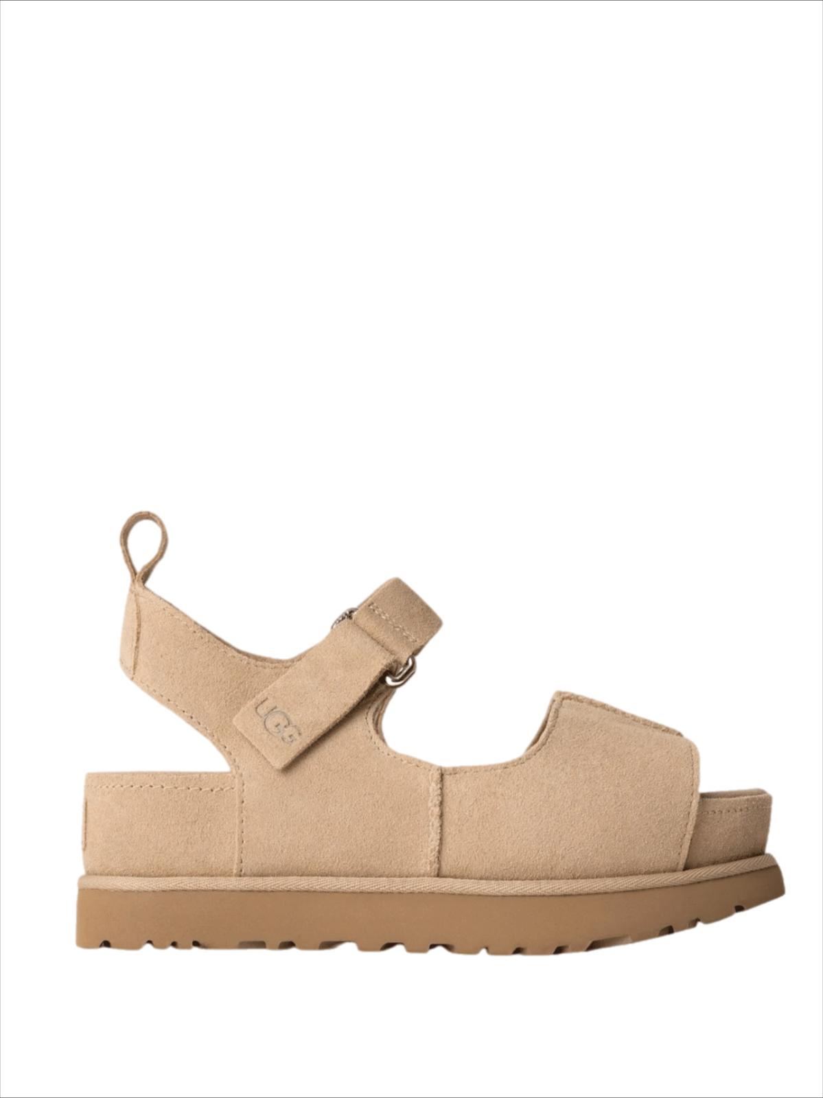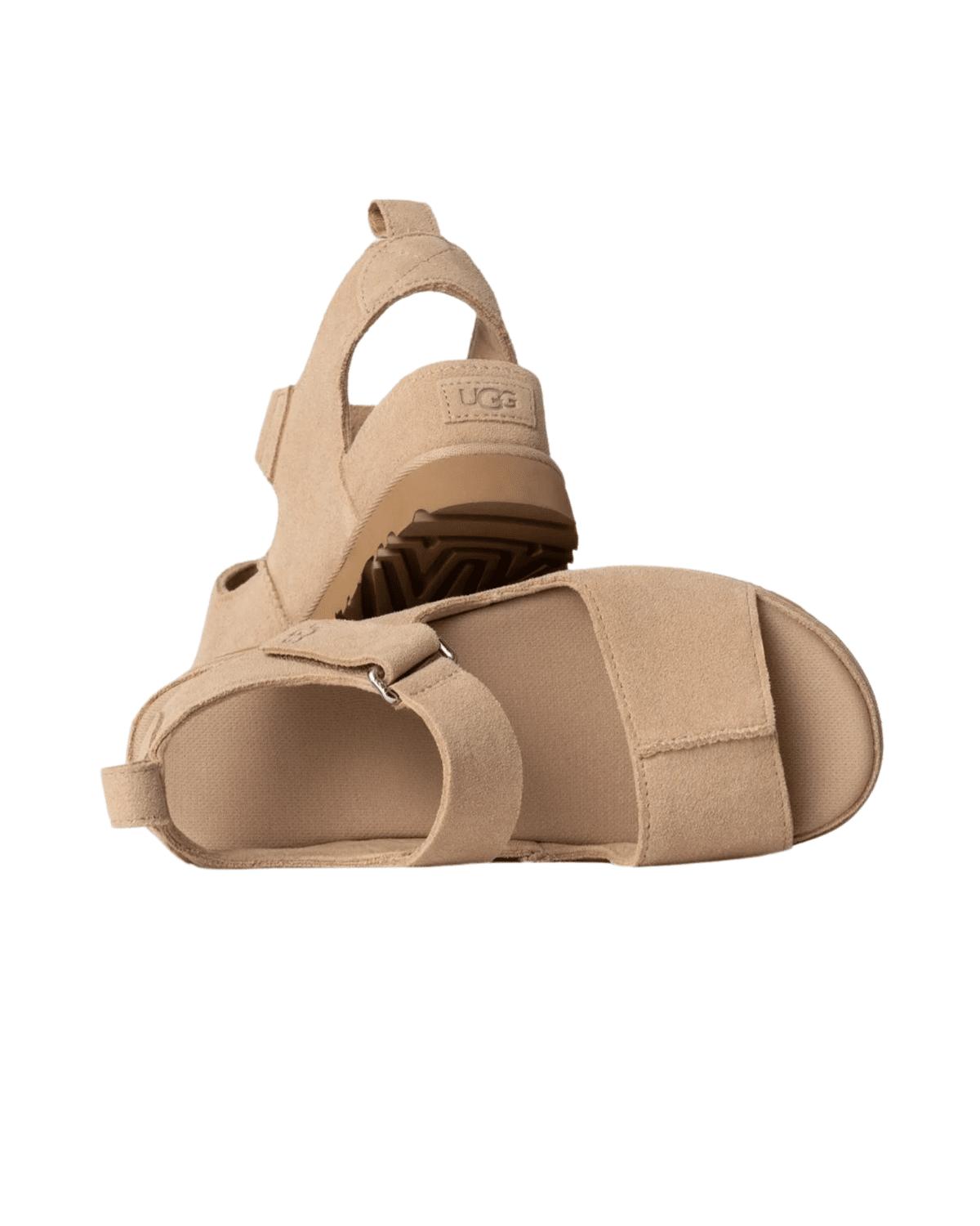 סנדלי זמש בעיצוב בית האופנה UGG. לסנדלים רצועה אחורית מתכווננות המאפשרת נעילה פשוטה והתאמה מדויקת לממדי כף רגלך. הסנדלים מעוטרות בלוגו UGG המוכר על גבי הרצועה, באזור העקב ועל גבי הסוליה. סנדלים סופר שיקיות המשתלבות בקלות עם מגוון סגנונות לבוש.